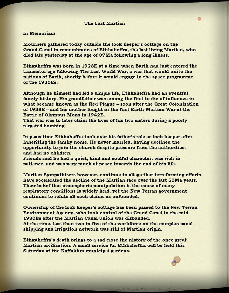 This was written for a Flash Fiction competition in New Scientist magazine. I wrote this story after I felt the first attempt didn't fit the competition theme of Forgotten Futures closely enough. I quite like the idea of this alternative Earth / Martian history, though not necessarily the way it might turn out as I imagined it.
